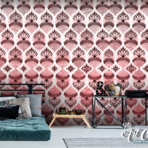 A beautiful small design wallpaper in sand pink with white daisies, speckled with little blue dots and framed with a scalloped fan.