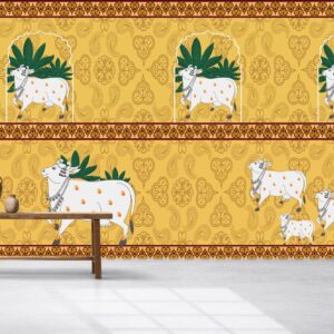 Pichwai Floral Cow Painting Inspired Yellow Wallpaper for Walls