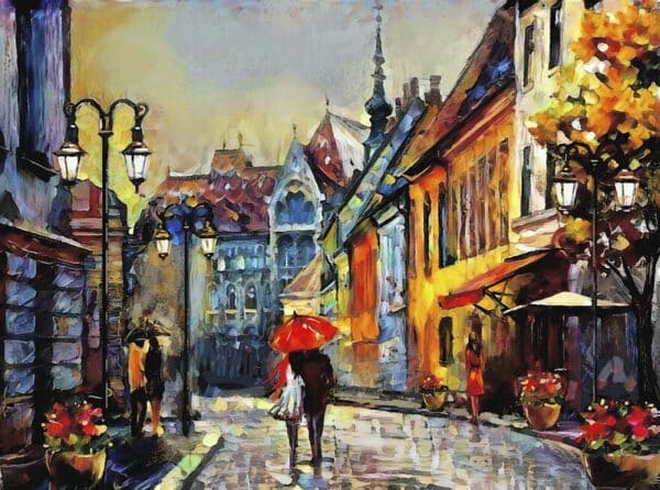 Be the first to review “A painting of a city street with people walking with umbrella” Cancel reply
