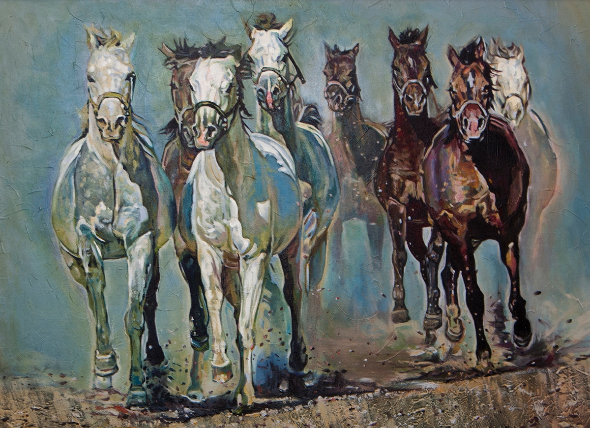 A painting of horses running