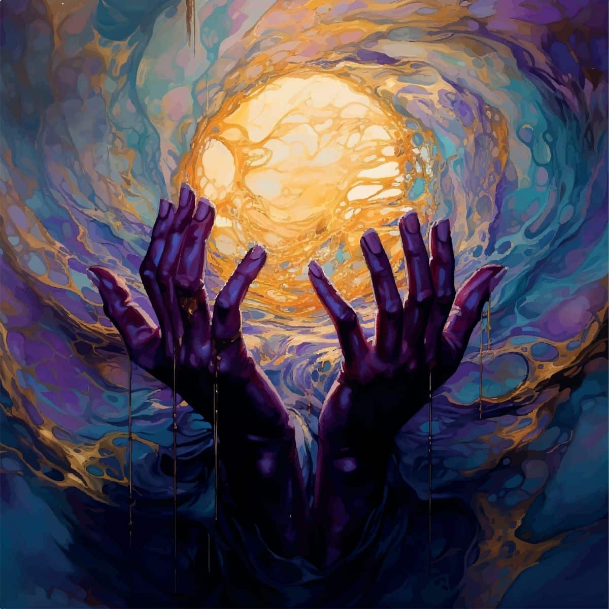 Abstract Ethereal Purple Teal And Gold Gratitude Hands Sun Wallpaper for Wall