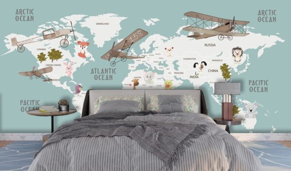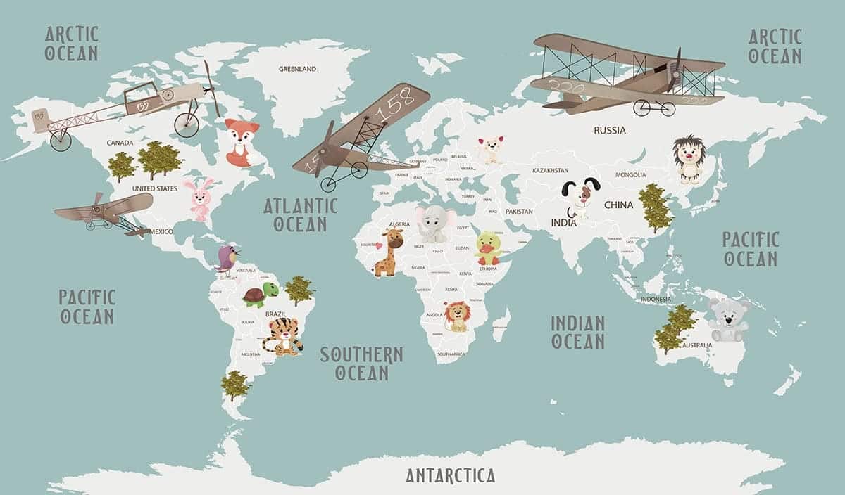 Kids Room Wallpaper, World Map With Cartoon Animals 29