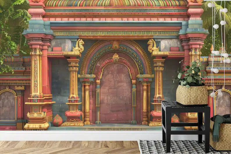 South Indian Hindu Temple Wall with Arch Decor Wall Gift, Art Print Photomural Wallpaper Mural Easy-Install Removeable Peel and Stick Decal