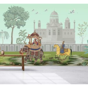 Bharat Indian Mughal Wallpaper – King & Queen in Royal Garden Wall Mural, Lush Green Background, Best Seller Room Decor
