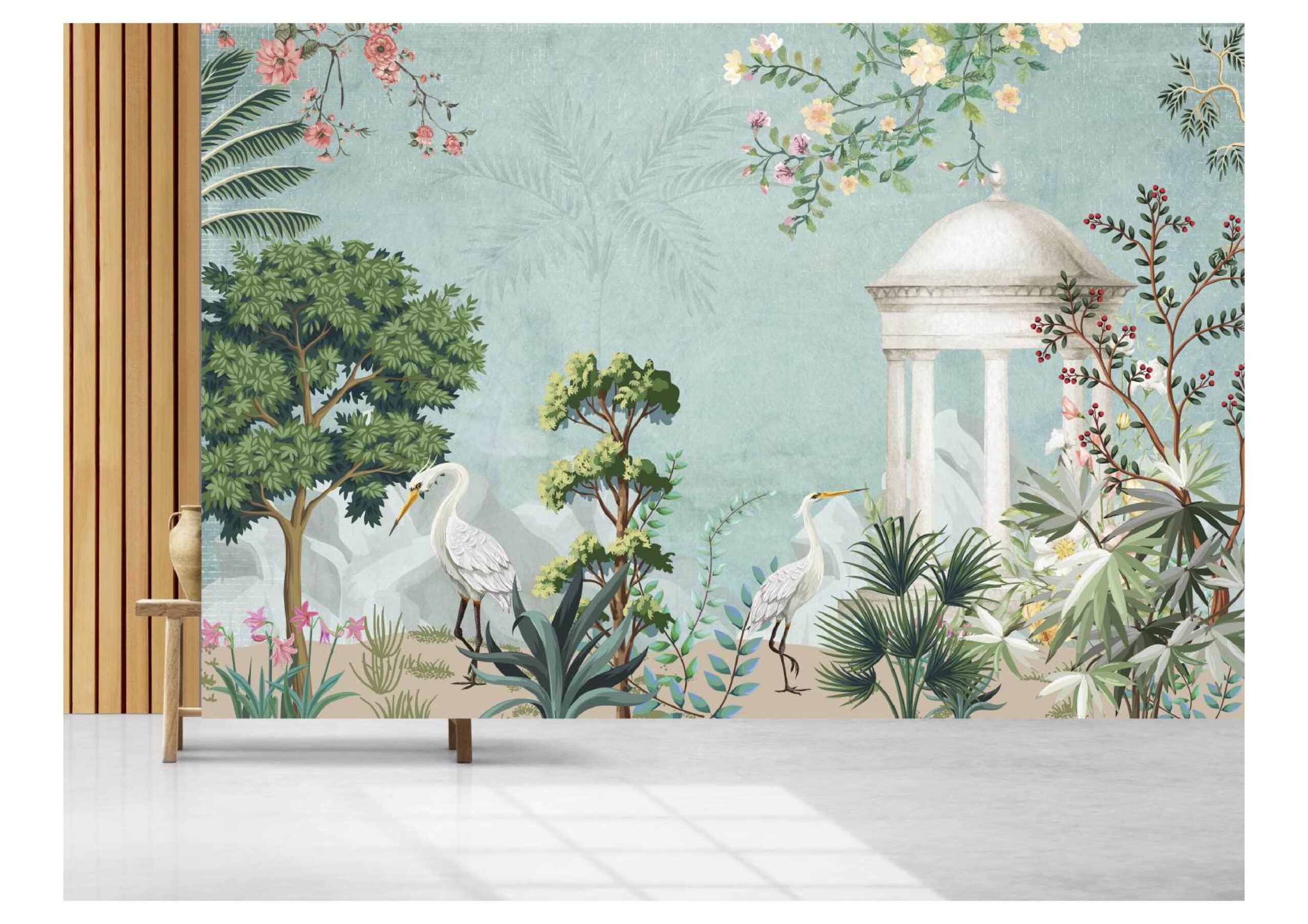 Tropical Park With Trees Peacock and Statues Wallpaper for Wall