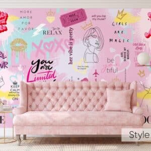 Girls Graffiti Print Wallpaper Pink Abstract Mural – Beauty Room Salon Spa Design Removable Wall Decal
