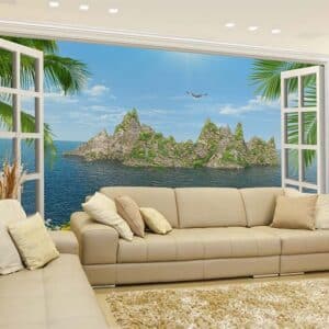 Ocean and Mountainous Island Window View Wallpaper Mural