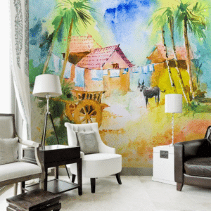 3D hand painted homes trees bullock cart cow rural landscape wallpaper
